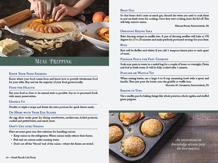 Do you seek ways to make everyday life easier? Here you will find hundreds of practical tips covering all aspects of keeping a home, from stain removal to homemade laundry detergent, from baking perfect piecrust to making recipe substitutions, from taming a cough to mending a cut. You’ll also find advice for canning fruits and vegetables, sewing, gardening, animal care, and more! Woven throughout are Amish sayings and proverbs and colorful photos, making this an enjoyable read and a perfect gift.